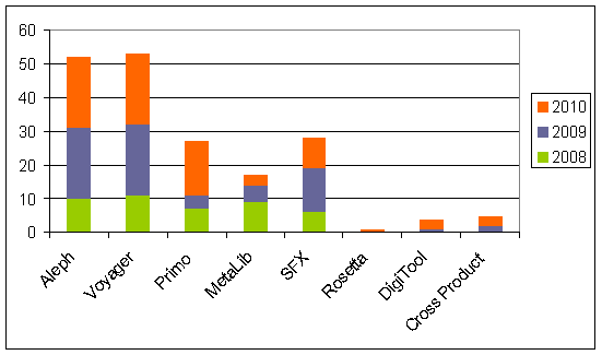 Two products from Ex Libris were represented in the survey results, Aleph, (139 responses) and Voyager, (154 responses); the company continues support, marketing, and developmlent for both of these ILS products. Ex Libris has announced Alma as its next generation system. Aleph and Voyager serve large and diverse organizations and offer very complex functionality, placing them into a tier of products that tend not receive superlative marks. Aleph received a mean score of 6.28 on ILS satisfaction, just a bit higher than that of Voyager (6.07). Perceptions of the company between these two products show slightly higher ratings from Voyager libraries (6.21) than those running Aleph (6.04); A simlar pattern emerged for customer support with libraries running Voyager slightly happier (6.16) than Aleph sites (6.07). 25.71 percent of Aleph libraries indicated interest in migrating to a new ILS with 14 mentioning Alma as a replacemetn candidate. 38.31 percent of Voyater libraries indicated interest in migrating to a new ILS with 21 mentioning Alma as a replacement candidate.